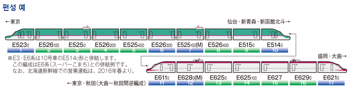 토믹스 E5 + E6 차량 조합. (M)으로 표시된 동력차가 각각 7호차, 12호차에 위치한 것을 보실 수 있다. 출처: 토믹스 공홈.