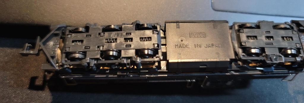 KATO DE10 배면. 차륜중 불투명한 면을 갖고 있는쪽이 고무타이어. 직찍. - 동일 회사의 동일 모델의 차량을 중련운전 하는 것이 best겠으나, 굳이 다른 차량을 이용 중련하고 싶다면 사전에 각 차의 속력차를 평가 한 뒤에 운전을 고려하도록. 극단적으로는 한 쪽의 동륜 고무타이어를 제거하는 것, 혹은 아예 모터를 빼버려서 T차로 만드는 것도 있겠지만 나중에 복구하기가 더 힘들어 질 지도 모르겠다. DCC를 사용하면 동력차별로 개별 출력을 조정하는 것도 가능하겠지만 조작이 복잡해지지 않을까 싶다. (9/14 추가: KATO에서 설명하는 몇 가지 자료를 봤더니 아예 중련용으로 동력 유닛에 타이어가 없는 부품도 따로 파는 것을 확인했습니다. 중련 기관차 중 한 대는 타이어가 있으면 주동력차가 되고, 다른 한 대에 타이어가 없으면 약간씩 공전하면서 합을 맞추면서도 구동력에는 힘을 더 보탤 수 있으니 이것도 좋은 방법이기는 하겠네요. 아래 사진은 카토 라운드하우스제 DD51 동력대차 (타이어 없음) 부품입니다.)