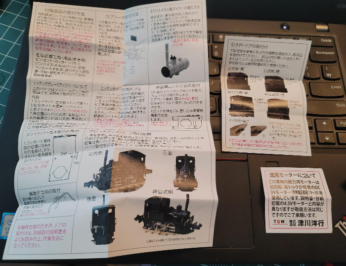 뚜껑을 열면 안에 본체, 커플러 관련 부속, 에칭파트, 장착된 플라스틱(안에 금속 코어가 들어가 있음) 보일러를 대체할 수 있는 미도장된 화이트메탈의 주조 보일러, 아리타 철도 차량의 특징이었다는 미닫이 문 에칭파트, 그리고 스폰지 뒤쪽으로는 올컬러의 설명서가 TMI 지만 불친절하게 개제되어 있다.