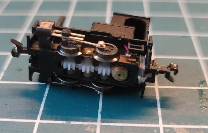 차량의 구동부는 위와 같다. 캐빈 안에 수직으로 서 있는 초소형 모터가 금색의 웜기어를 물고있고, 이를 차축에 물려진 흰색 평기어 3개가 B형 동륜 전체에 동력을 전달하는 방식이다. 그리고 4개의 동륜이 선로로부터 집전하여 이를 양쪽 프레임에 위치한 철판에 전기를 전달하고, 뒤이어 사진에 보이는 납땜된 (빨간색) 전선을 통해 모터로 흘려준다. 가장 원초적이고 기본적인 철도모형의, 전기 인가부터 동력 구동까지 메커니즘을 뜯지 않고도 다 보여주는 교과서 같은 차량이라고 할 수 있다.