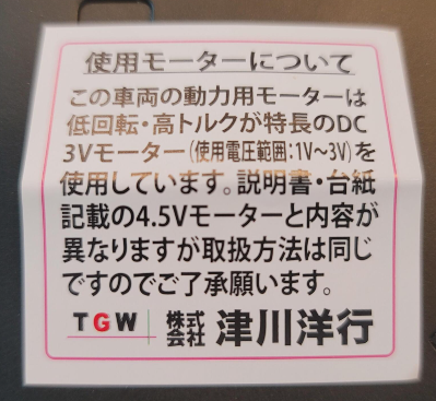 이 차량의 동력용 모터는 저회전, 고토크가 특징인 DC 3V 모터(사용전압범위: 1~3V)를 사용하고 있습니다. 설명서, 포장지에 기재된 4.5V 모터와 내용이 다릅니다만 취급방법은 동일하므로 양해 부탁합니다.