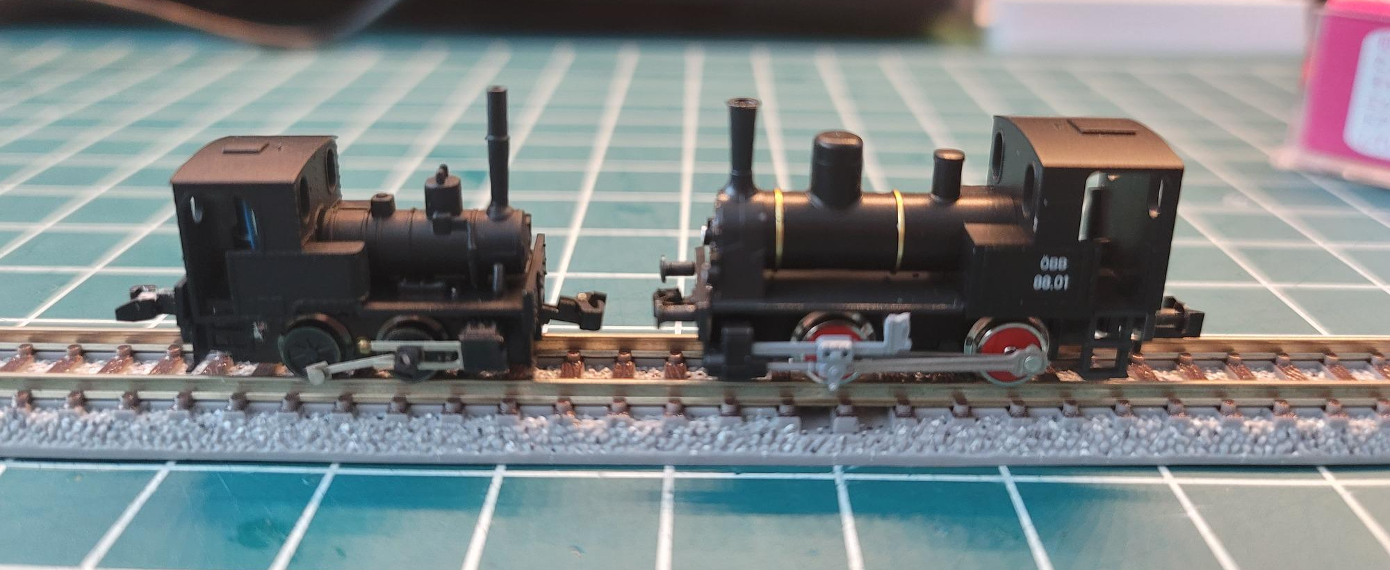 카토 포켓라인 치비로코 기관차 (본 제품은 카토가 독일 LEMKE사 OEM납품하는 OBB BR88 차량세트)와 크기 비교. 참고로 오른쪽 증기 기관차 모형도 매우 작은 차량인데, 결정적으로 무동력 차량이며 3량 세트 중 중간 객차에 동력이 들어 있어 기관차를 밀고 가는 구조. 다만 이 쪽은 코어리스 모터로 동력이 업그레이드 되어 있으니 주행 품질이 코펠 차량에 비할 바가 아니다.