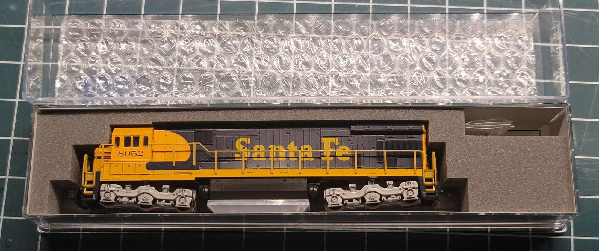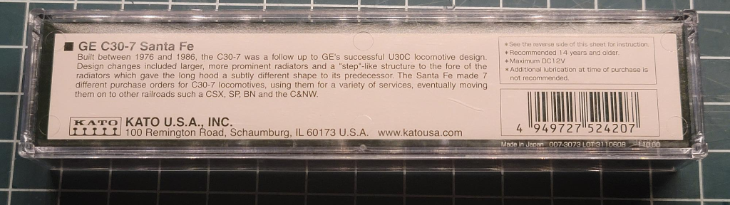 케이스는 미국향 제품이라고 여느 카토의 것과 다를 것이 없어 보이는데, 일본 내수용 제품과 다른 점이 있다면 뒷면의 설명란에 예의 차량 측면부 도면이 없고 '관수금속'이 아닌 'KATO U.S.A., INC.'로 표시된 것. '산타페'라는 운송업체 소속의 차량이라고 한다. U30이라는 기관차의 디자인을 충실히 따르고 있고 거기에 뭔가 기능을 다양하게 추가했으며, 1976년 부터 10년간 7차례에 걸쳐 발주를 내어 총 1,137대가 생산되었고 여러군데서 두루두루 잘 사용했다는 내용이다.