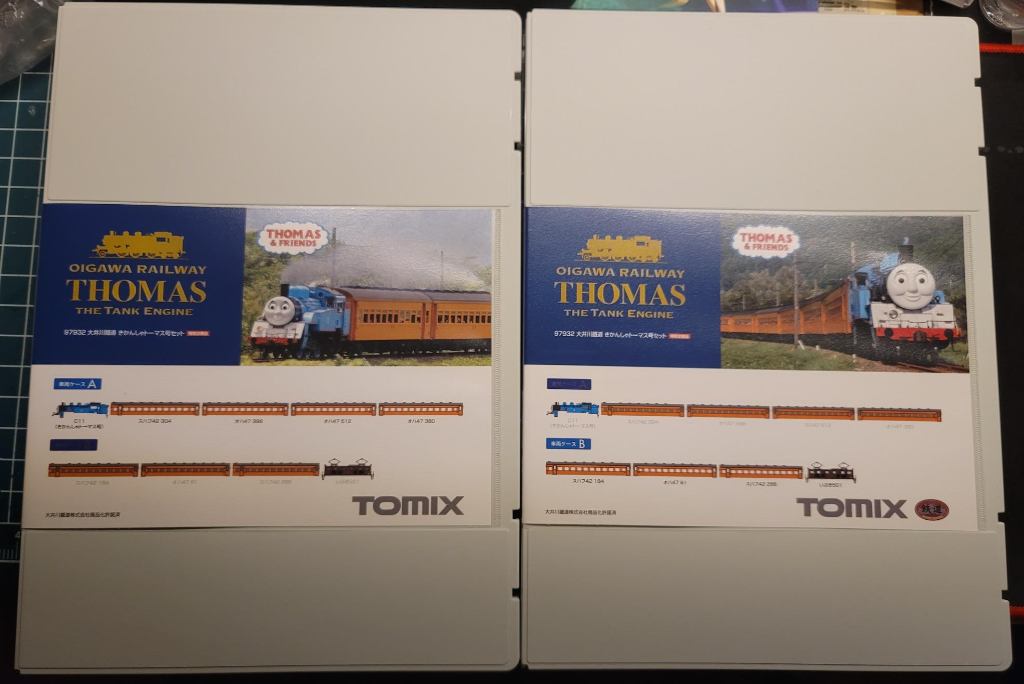 두 박스의 띠지가 다르게 생겼다. 아래에 전체 편성표가 있고, 거기에 Set A/Set B 내용물이 표시되어 있다. 특별히 테츠코레 사양으로 나온 이부키 501에 대해서 다시금 '테츠코레'마크를 박스 겉면에 표시함. Set A는 C11 토마스와 4량의 객차 (보조동력객차 오하 47형 포함)로 총 5량 구성, Set B는 이부키 501 전기기관차(테츠코레 사양)과 3량 객차 총 4량 구성이다. 견인력에 따른 편성 수, 그리고 동력차량의 유/무를 고려했을 때는 세트 A가 총 4량, 세트 B가 총 5량 (보조동력차 포함) 이 적절하지 않았을까 싶기도 하고.