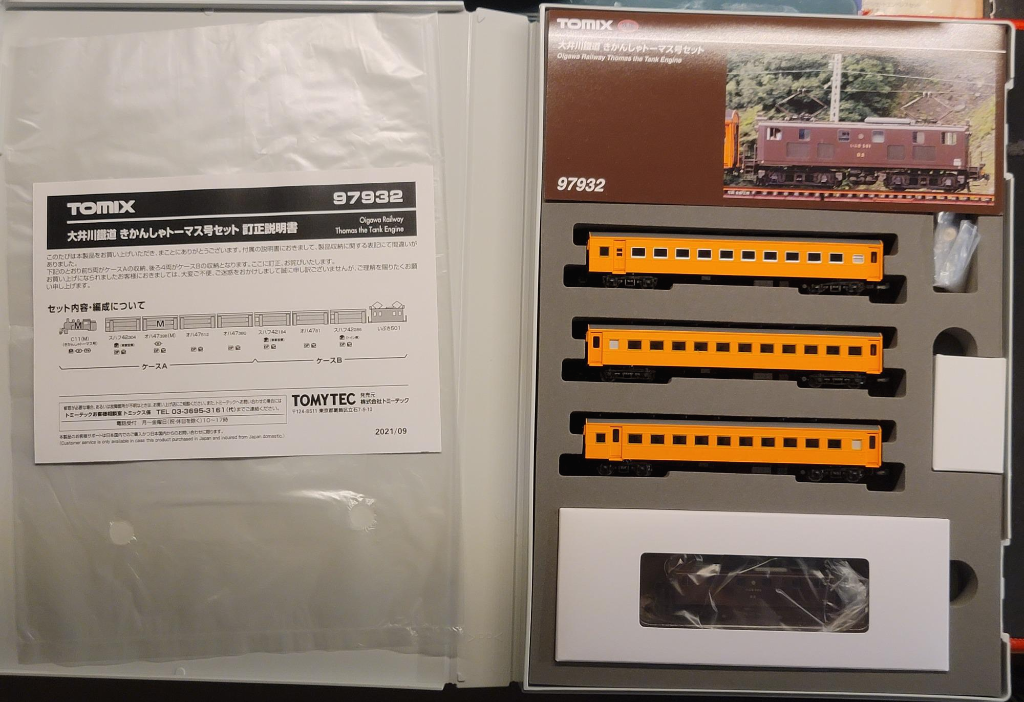 세트 A를 열면 취급설명서, 주의사항, 그리고 C11 토마스 사양과 객차 4대가 구성되어 있다. 객차에 차량 번호는 따로 없어서 기존 토믹스 제품대로 인레타를 따로 넣어주나 싶었는데 없다. 확인 해 보니 실제 객차도 차번이 안새겨져 있음. 도색하면서 다시 써 넣지 않은 것 같음(너무 설정에 충실하네). 객차 중 두 번째 위치한 차량이 바로 오하 47형, 보조동력차가 되겠다.