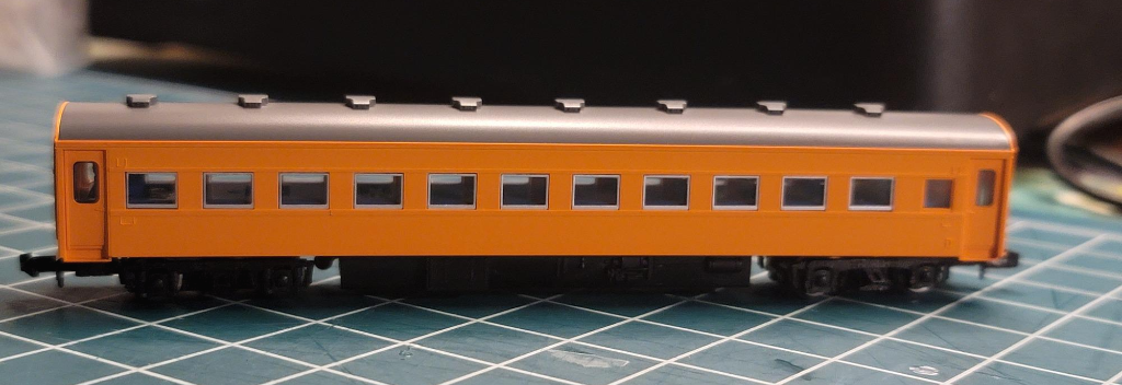 C11의 견인력이 7량의 장편성을 끌 만큼 힘이 좋다고 보긴 어려울 듯 하여(가능했다고 하더라도 지금의 연령을 고려하면 무리가 아닐까. 카토 오이가와 철도 카와네지호 세트도 겨우 객차 3량이 전편성이었는데...) 실제 편성이 앞/뒤로 기관차를 배치한 상태로 객차를 7량 끌고 다니는지 궁금했는데, 한 철덕의 실제 편성이 지나가는 비디오 클립을 보고 바로 납득. 객차는 일본의 전형적인 구형 객차이지만 밝은 오렌지(노랑?)을 접목시켜 조금 다른 느낌을 준다. 가상의 설정에도 써 먹기 좋은 차량임.