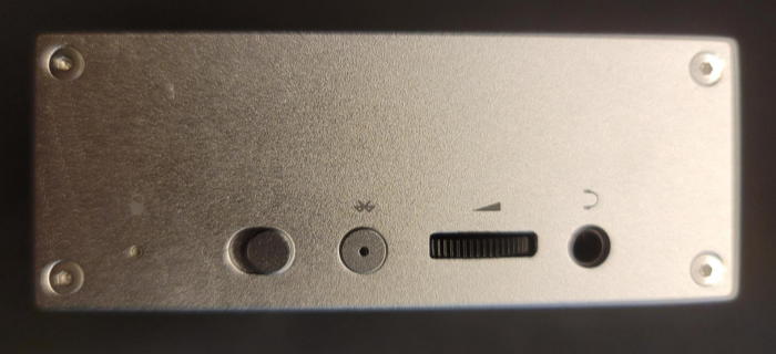 기기 우측방. 좌로부터 배터리 15% 이하로 떨어지면 붉은 불이 나온다는 표시등, 블루투스 입/출력 전환하는 스위치, 블루투스 페어링 버튼, 볼륨, 그리고 3.5파이 이어폰 커넥터이다. 1.2V 에네루프 전지 기준으로 play 해 보니 대략 6~8시간 정도 안정적으로 작동한다. 에네뷔와 같은 외부 전원 스피커를 '유선으로' 연결하면 상대적으로 재생수명이 길어지는 것 같다.