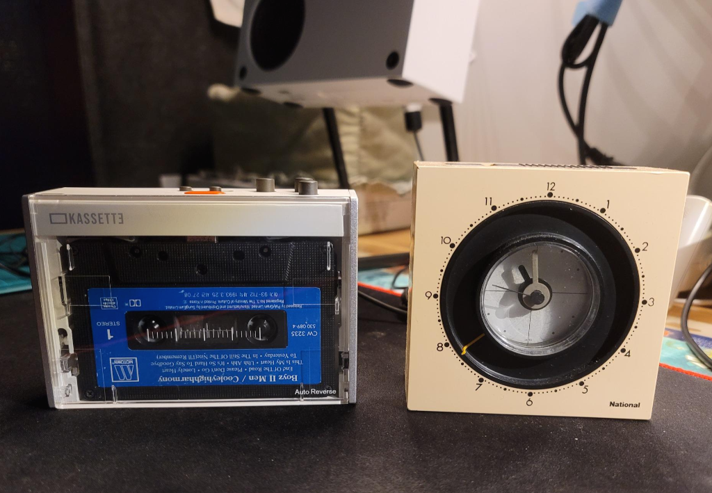 나름 80년대 굿디자인을 받았다는 마쓰시타(내쇼날)의 TG-451 탁상시계와 함께. 네모네모가 상호 어울림. 뒤의 에네뷔도. 자, 결론이다. 혹여 테이프를 써 보지 않은 젊은 세대들의 호기심을 자극하는 것 외에도, 과거 테이프 워크맨을 사용했던 아저씨 아줌마들의 추억을 소환할 목적까지 포함하여 이 제품을 기획했다면, 죄송하지만 이런 것은 만들어서도 안되고 사 줘서도 안된다.