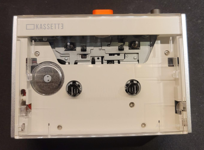 정면. 방대한 투명창이 이 제품의 특징이라 한다. 개인적으로 디터람스 룩의 포스트 모더니즘 한 이미지를 노렸다면 저 'KASSETTE'로고는 작게 만들거나 빼는게 좋았겠다 싶다. 그리고 사용중에는 테이프가 가려주기는 하지만 모터나 작동기구가 보이는 것도 조금은 가리는 편이 좋지 않았을까. 그리고 기계식 카세트 플레이어의 한계이긴 한데, 투명창이면 카세트도 역방향으로 삽입되도록 레이아웃을 구성했다면 좋았을 것이다. 판매되었던, 지금도 판매되고 있는 테이프 라벨들 대부분 역방향으로 삽입되어야 글자가 뒤집히지 않으니까.
