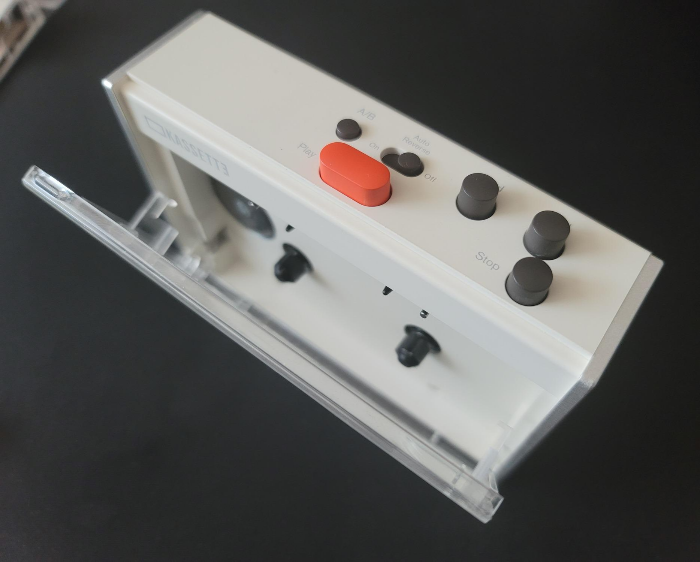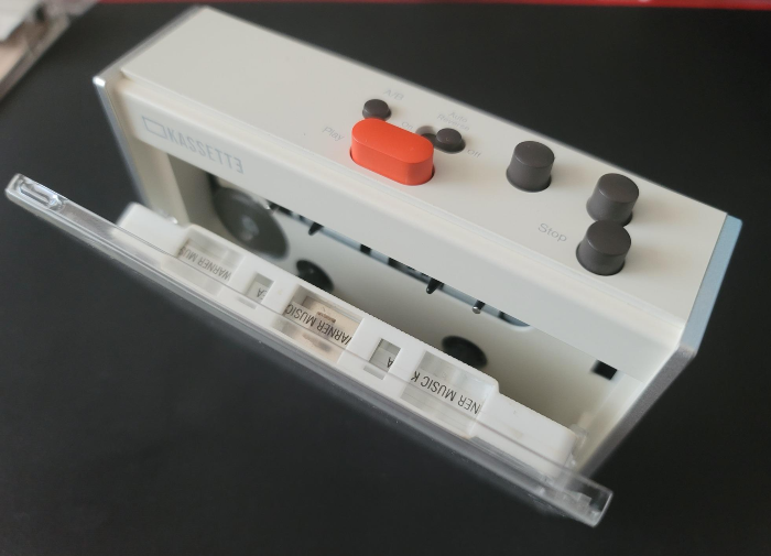 아래로 꽂는 테이프 삽입의 예. 반면 데크 드라이빙 유닛의 움직임과 설계를 단순화 해야하는 저가형 보급형 데크의 경우, 특히 작동 스위치가 본체 위에 있는 플레이어는 재생부가 데크의 윗면을 향하도록 삽입한다. 아래의 블라썸 카세트 플레이어의 삽입 방향이 바로 후자의 예가 된다.