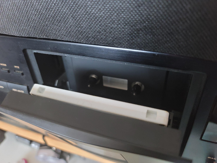 보급형 데크의 카세트 삽입형태. 보시다시피 라벨의 글자가 뒤집혀져 있어서 보기에 딱 좋지는 않다. 그래도 작동 메커니즘이 단순하고 고장날 부분이 별로 없어, 그야말로 보급형 데크의 드라이빙부의 설계에는 최적화 된 구성이다. 그리고 워낙 보편적인 재생 방식이다 보니, 아래로 삽입하는 것 보다 더 익숙한 이미지로 기억하는 사람들도 많다.
