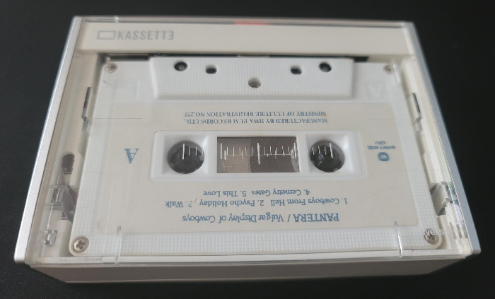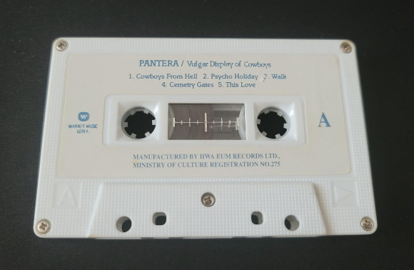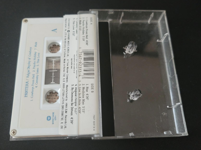 잠시 오늘의 모델이 되어줄 카세트 테이프 앨범을 소개한다. 90년대 메탈의 독보적인 탑이라 할 수 있는 판테라의 1993년 국내 정식 출시 컴필레이션 앨범, 'Vulgar Display of COWBOYS' 이다. 메이저 레이블 데뷔 앨범인 'Cowboys from Hell' 과 2집 'Vulgar Display of Power'의 짬뽕 앨범으로, 90년대 당시만 해도 소위 미풍양속을 해친다는 이유로 '금지곡'으로 지정되어 발매가 되지 않는 곡들이 상당하던 시절에 출시된, 안타깝지만 지금에 와서는 오히려 '초기 명곡 best'가 되어버린 그런 사례가 되겠다. 물론 1집의 'Primal Concrete Sledge'나 'Domination', 2집의 'Fxxking Hostile'등의 명곡이 검열로 인해 빠져버린 것은 그 당시에는 안타까운 일이었지만 2021년 지금은 어떤 방식으로든 금지곡 없이 잘 들을수 있으니 그저 과거의 아쉬움이라고 묻어두고 하나의 시대적인 증거 자료로써 잘 보존된다면 나름의 가치가 있는 음반이 아닐까 한다.