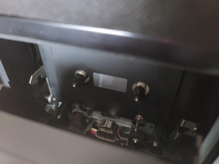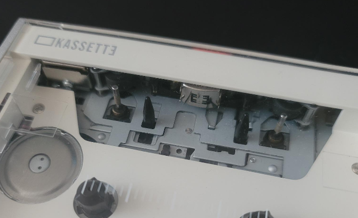 양쪽의 핀치롤과 중심의 재생헤드, 그리고 돌출된 각 구성요소들 확인. 그 외에도 테이프의 재생이나 주행을 최적화 하기 위한 온갖 복잡하고 다양한 장비들이 이 다섯개의 구멍을 활용하여 작동된다고 보시면 된다. 위의 플레이어에 달려있는 기구들과 카세트 테이프를 매칭시켜보면 됨.