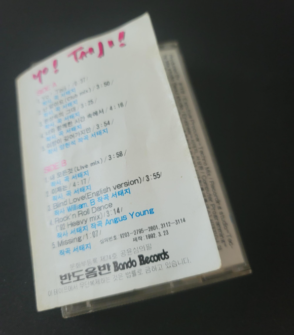 케이스를 열면 카세트 테이프 본체, 그리고 이를 감싼 속지 (소위 최근 J-card라고 일컫는 그것)이 있다. 얇은 한 장으로 playlist 만 간략하게 기재된 것 부터, 앨범의 소개 및 가사까지 길죽하게 말려져 있는 것 까지 다양한 속지가 존재한다. 심지어 92년도 출시된 아래의 서태지 1집 같은 경우, 속지가 바깥 케이스로 연장되어 케이스를 전체적으로 감싸는 형태로 구성되기도 했다. 저 상태로 갖고 있으면 덜렁덜렁하니 잘 접어서 안에다 넣었었지요.