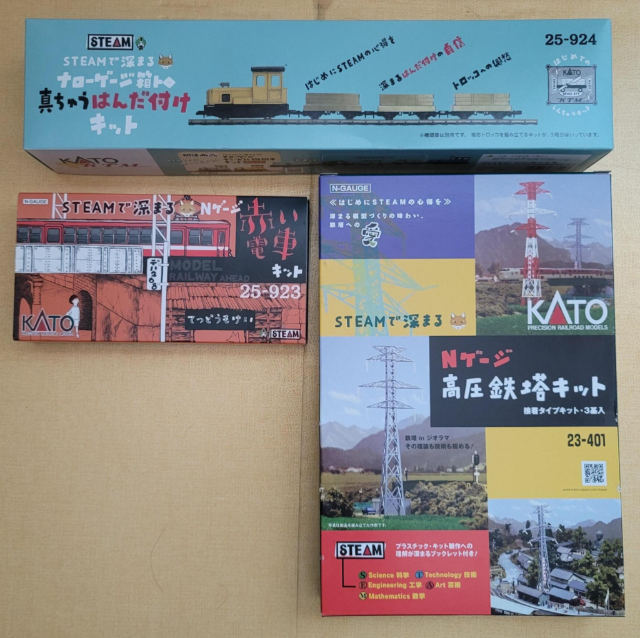 방바닥 머리카락은 가볍게 무시 해 주세요 ㅠㅠ 기대의 카토 'STEAM에 깊게 빠지다' 4개 제품 중 3개가 도착. 위로부터 Narrow gauge 상자트럭차 - 납땜인두 포함 키트, 붉은 전차 키트, 그리고 고압첨탑 키트이다. 당장은 여유가 없어서 풀어 볼 수는 없고 11월에 출시 예정인 Narrow gauge 디젤차가 입고 된 이후 여유가 될 때 마다 하나 하나 양파껍질 벗기듯 열어 볼 예정이다. 뭔갈 넋놓고 만들 수 있다는 생각에 벌써부터 두근두근.