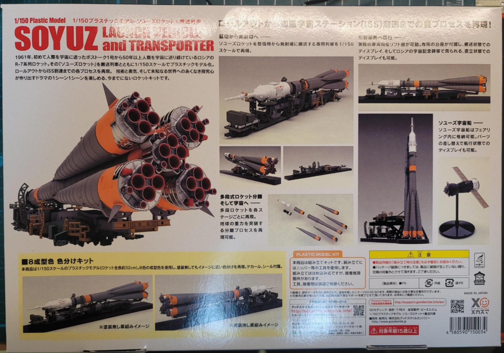 상자의 뒷면을 보면 조립 완료된 로케트와 트랜스포터의 작례, 그리고 제품의 설명 등이 간략하게 기재되어 있다. 트랜스포터는 이동모드, 발사대에 세우는 모드 두 가지로 구현할 수 있으며, 로켓도 다단으로 분리 가능, 1단 페이로드에 소유즈 우주선을 수납하거나 꺼내서 별도의 DP를 하는 것도 가능하게 되어 있다(부품은 선택 조립식).