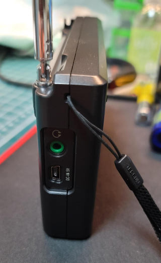 반대쪽은 라디오의 생명이라 할 수 있는 텔레스코픽 안테나. 몸체 대비 3배 정도 뻗어나간다. 단파 수신하려면 저 정도의 길이는 되어야 하겠지. 측면으로는 스테레오 헤드폰 잭, 그리고 본체를 충전할 때 사용하는 마이크로 USB 잭이 위치하고 있다. 이 라디오의 한 가지 좋은 점이라고 하면, 에네루프 같은 충전지를 넣어두면 이 잭을 통해서 5V로 외부 전원을 공급받음과 동시에 충전지의 충전도 가능하다는 것이다. 라디오 특성 상 한 번 배터리를 넣으면 또 오랫동안 재생이 가능하니 자주 충전 할 필요도 없음.
