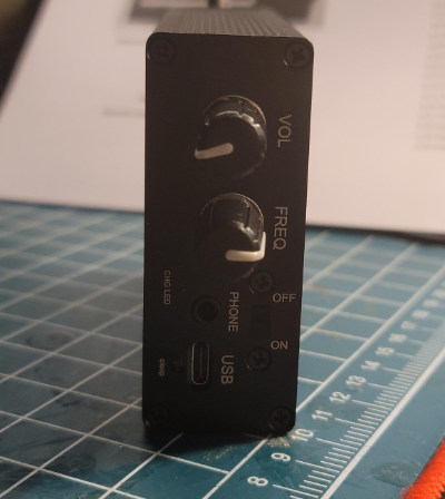 본체 우측. 위로부터 push 기능이 있는 볼륨 노브, Frequency 노브, 그리고 슬라이드 타입의 본체의 마스터 전원 스위치인데 아마도 내장 배터리와의 전원을 끊는 기능인 듯. OFF에 놓으면 내장 시계도 함께 00시로 리셋된다. 헐. 그 옆에 이어폰을 끼울 수 있는 3.5파이 단자, 충전 및 펌웨어 업그레이드를 위한 PC 접속용 C-type USB 단자가 있다. 그 외에 본체 충전 시 붉은 빛을 띄는 LED 램프, sleep이라 적힌 리셋버튼 같은 것이 보이는데 이건 기능을 모르겠다.