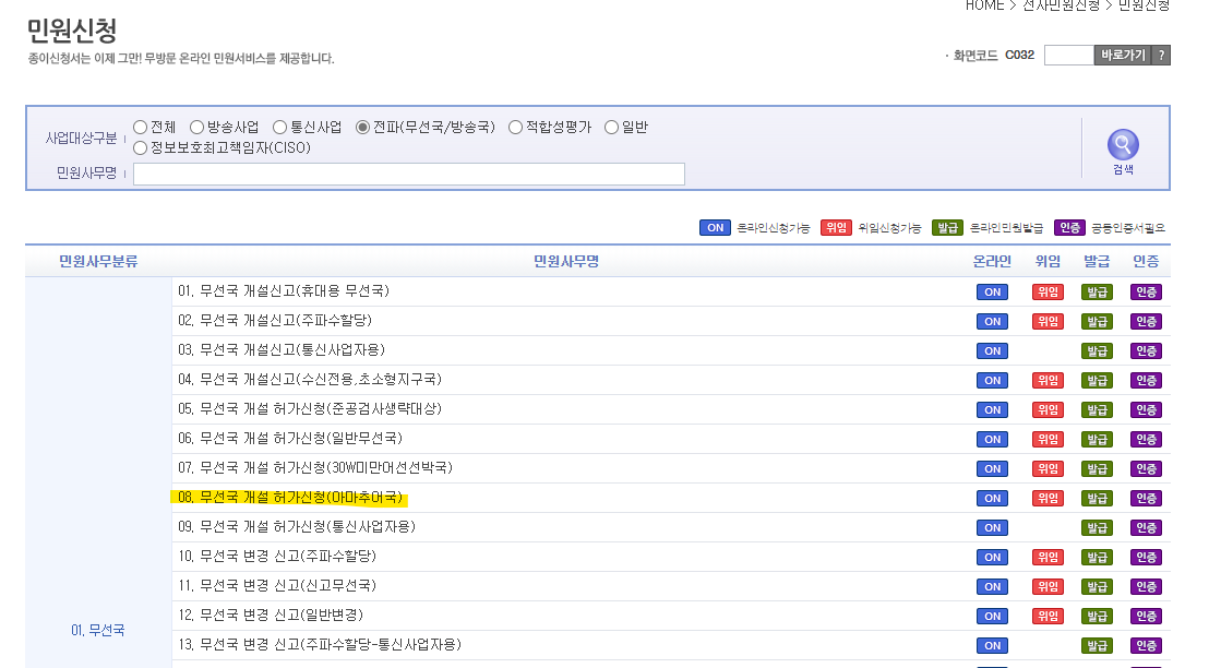 그러면 아래와 같은 다수의 민원신청 분류를 보실 수 있으며, 여기에서 8. 무선국 개설 허가신청(아마추어국)을 클릭한다.