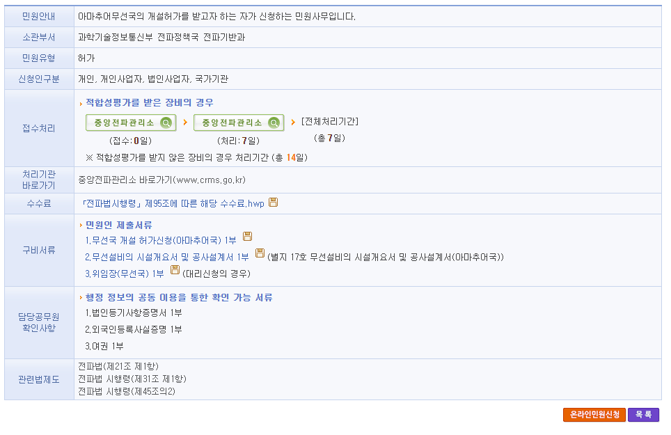 이후 첫 번째 창에 민원신청하는 방법과 그 절차가 소개되어 있다. 이 곳에 유첨된 두 가지 양식(무선국허가신청서, 시설개요서 및 공사설계서)를 다운받아 작성 후,