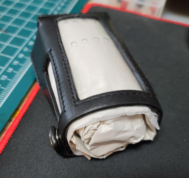 정품이라고 뭐 특별한 패키지에 포장되어 온 건 아니고 그냥 일반 지퍼백에 넣어져 위와 같이 종이 완충재가 꽉꽉 들어 찬 상태로 날아옴. 위쪽에 달려있는 똑딱이로 체결하게 되어 있다. 냄새를 킁킁 맡아보니 천연가죽 맞는 것 같은데 모르겠음.