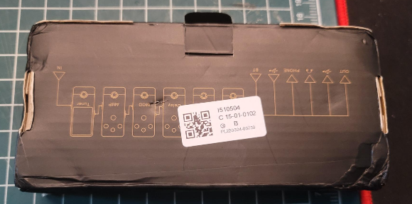 내용물은 이펙터 본체, 케이블 두 가지(녹음용 USB to 오디오잭, 그리고 충전잭) 그리고 英/中 매뉴얼로 간소하다. 이펙터에 포함된 기능은 오른쪽 기타 인풋으로부터 왼쪽 앰프 인풋까지 순서로 드라이브 - 모듈레이션(페이저/코러스) - 딜레이 - 리버브 - 캐비넷 시뮬레이션 - 볼륨 이다. 사진에서 보시듯 바닥면이 조금 울퉁불퉁한데, 기분탓은 아닌 것 같고 동작에 문제만 없으면 그러려니 해야지. 시리얼 넘버는 어디다 갖다 치웠을까.