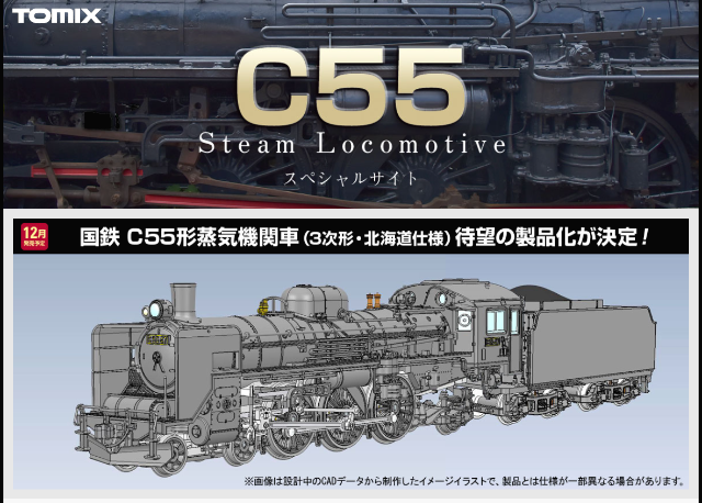 2022년 12월 출시 목표로 중형 여객 기관차인 C55를 토믹스에서 모형화 발매한다 한다. 일본 철도에 식견이 부족한 사람에게는 특설 페이지까지 마련해서 본 제품의 개발 계획을 홍보하는 것이 좀 의아한데, 소개글을 보니 차량의 역사를 떠나 토믹스의 사정이 있었던 것 같다. 1978년도 토믹스 카탈로그에 제품 출시계획을 공지하고 근년 중 출시를 계획하고 있었으나, 모종의 사정으로 페이퍼플랜으로 끝나고 그 약속이 40여년을 훌쩍 넘기고 만 것. 메이커 측의 해명으로는 '실차와의 프로포션을 중시하는 설계 사상의 제한 때문'이었다고 이야기 하고 있는데, C55~C57형의 얄쌍한 보일러 사이즈를 보면 한 편으론 이해가 되기도 한다. 당시 기술로 도저히 보일러 안에 모터 및 동력 기구를 넣을 방법이 없었던 것. 데포르메 측면에서 스케일을 조정하거나(카토), 차량의 높이를 높여서 모터 넣을 공간을 확보하거나(마이크로에이스) 할 생각을 아예 하지 않은 모양.