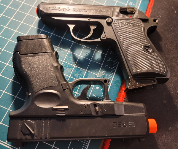 아카데미 G26C와 비교. 크기는 거의 동일하고, 더블스택 구조인 G26C 쪽이 좀 더 투박하고 굵긴 하다. 자기가 모형총 컬렉터다, 장식할 조그만 총이 필요하다, 혹은 그냥 책상에 놓고 주물주물 할 작은 모형총 필요하다 하시는 분들은 괜찮은 선택이 될 수도 있으나, 저 총으로 제대로 된 사격을 해야지 마음 먹으신 분은 다른 총을 알아보는 것이 좋겠다. 그리고 가격은 거의 두 배 이지만 수입되는 비비총기 생각하면 꽤 염가이니(그래도 2만 5천원...인데 이 바닥도 제품들 가격들 보니 이 정도는 그냥 껌값이더라고요...), 차라리 돈을 더 충전하여 메탈슬라이드 버전을 사시는 것을 추천한다. 차가운 메탈 질감이 사실감을 더 높여 줄 뿐만 아니라, 이너바렐도 황동, 탄창도 두 개이므로, 일반 모델을 별도 부품을 사서 업그레이드하는 것 보다 훨씬 혜자 구성이기 때문이다.