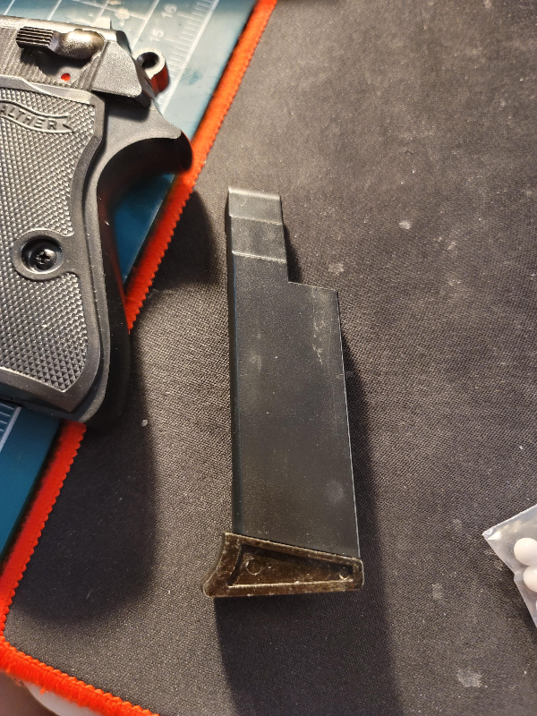 매거진(탄창). 워낙 조그만 총이다보니, 내부 형태도 현실감 있게 만들기는 어려웠던 듯 하다. 전형적인 짤짤이 탄창이고, 8발~10발 정도가 안정적으로 삽입된다. 탄알을 잡아주는 홀딩력은 그다지 좋지 않은 것 같고, 총알을 밀어주는 스프링의 내구도가 높지 않다는 이야기가 있다.