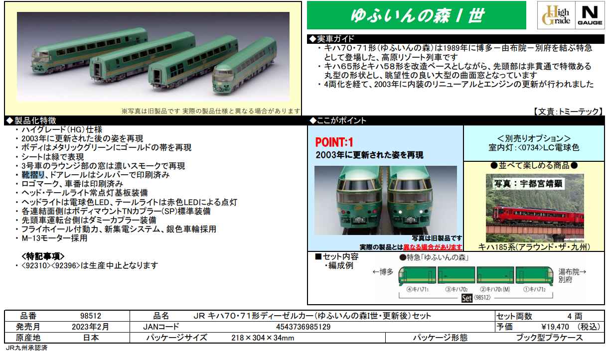 생각보다 유후인노모리 1세 제품의 판매 실적이 꾸준한 것인지, 내년 2월 발매 계획으로 새로운 품번으로 신제품이 나온다 한다. 신혼여행을 유후인에서 보냈던지라, 추억 간직 겸 해서 본 제품을 하나 가지고 있고 아래와 같이 블로그에 모형을 소개도 한 바 있다. 실제 탄 유후인노모리는 1세가 아니라 3세를 탔지만.