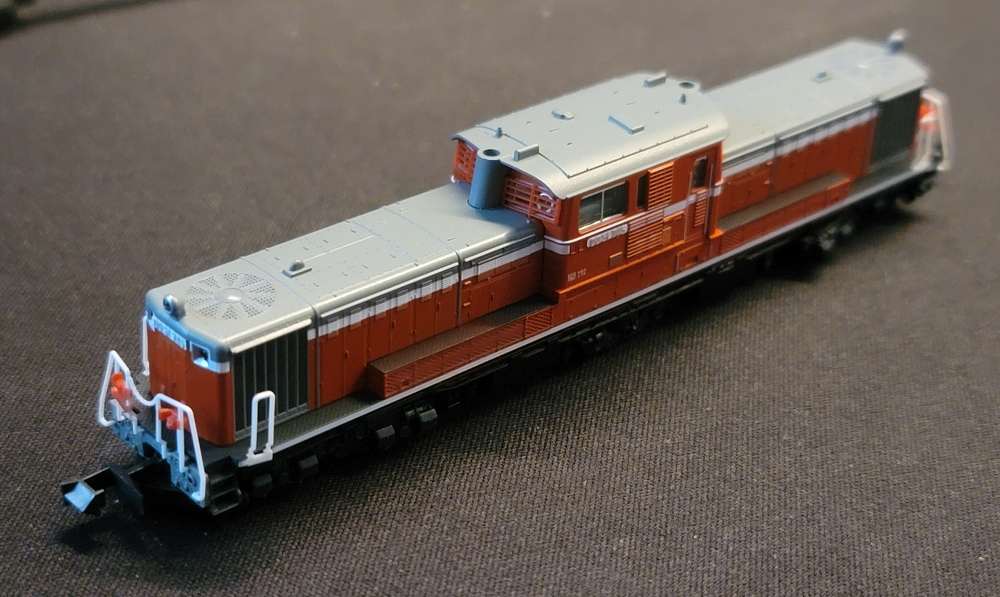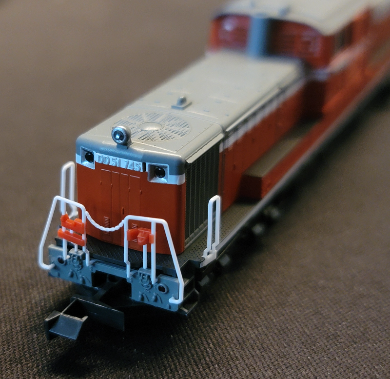 차량의 측면, 차량의 형상은 앞 뒤 거의 대칭이며 일부 천정의 기기류 모양에 따라 앞/뒤를 구분할 수 있을 정도이다. 이 차량은 진행 방향으로 운전대가 각각 양쪽으로 위치한다. DD51차량하면 거의 예외가 없을 정도로 위의 컬러 배치를 따르게 되며, JR 홋카이도의 북극성 전용 견인기, JR 화물 소속, 혹은 사철로 판매 및 양도된 차량에 한해 컬러가 다른 특징을 갖는다. 이쪽 부류의 차량이 아주 좋아서 구매 했다기 보다는 구색 갖추기, 즉 증기기관차가 있는 레이아웃 정경 옆으로 상호 복선 주행시키거나 구형 객차 차량과 어울려 주기 정도 수준인지라, 색놀이 혹은 번호판 놀이라고 불리우는 여러차량 구매하기 놀이는 딱히 하지는 않고 있다. SL야마구치호 용 DD51 1043 같은 건 아예 검토도 하지 않았으니.