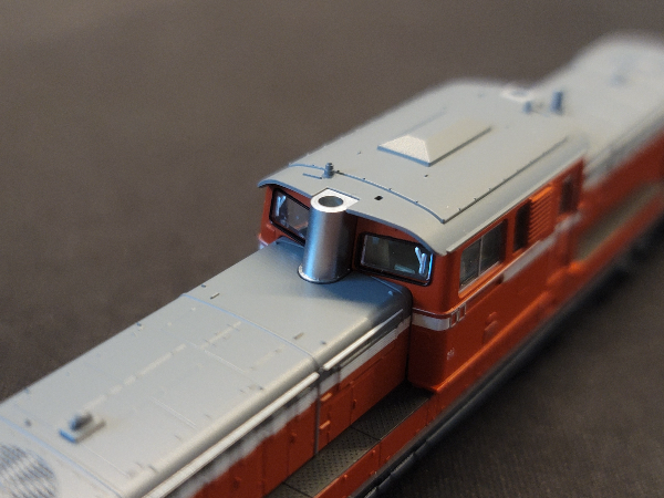 반면 일반형 차량은 이렇게 일반 자동차에 달려있는 막대기형 와이퍼가 붙어있고 유리창은 오픈되어 있음. 다카사키 차량기지 소속 800번대 차량의 특징인 배기구의 은색 표현이 특징적이며, 지붕의 형태가 500번대와 다른 것도 주목해서 보시면 되겠다. 도색에 조예가 깊은 분들은 디젤 연기에 의한 검댕을 이 곳에 표현하기도 한다. 디젤 엔진이 앞 뒤 두 개 설치되어 있어서 연기를 뿜어내는 굴뚝도 캐빈 앞뒤 두 곳에 위치하고 있다.