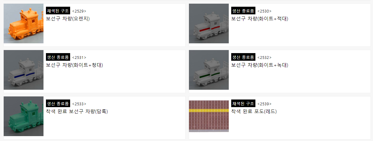 철도모형, 특히 디오라마 오랫동안 꾸며 보셨던 분들은 잘 알고 계실 제품이지 싶다. 그린맥스에서 보선용 사업용 차량의 프라스틱 키트를 440엔이라는 저렴한 가격에 판매하고 있다. A4 사이즈 종이 반 정도 되는 런너 한 장에 보선용 소형 디젤 동차 1량, 보선용 자재 운반차 1량, 그리고 레일교환용 운반차 2량 이렇게 1 세트로 조립할 수 있도록 구성된다. 다양한 수요의 유저층을 위해, 출시 텀도 꽤 빈번하고 사출물 색상도 다양하게 나온다 - 채색의 기본 베이스가 되는 회색부터, 노랑, 오렌지, 형광그린, 흰색 등등...
