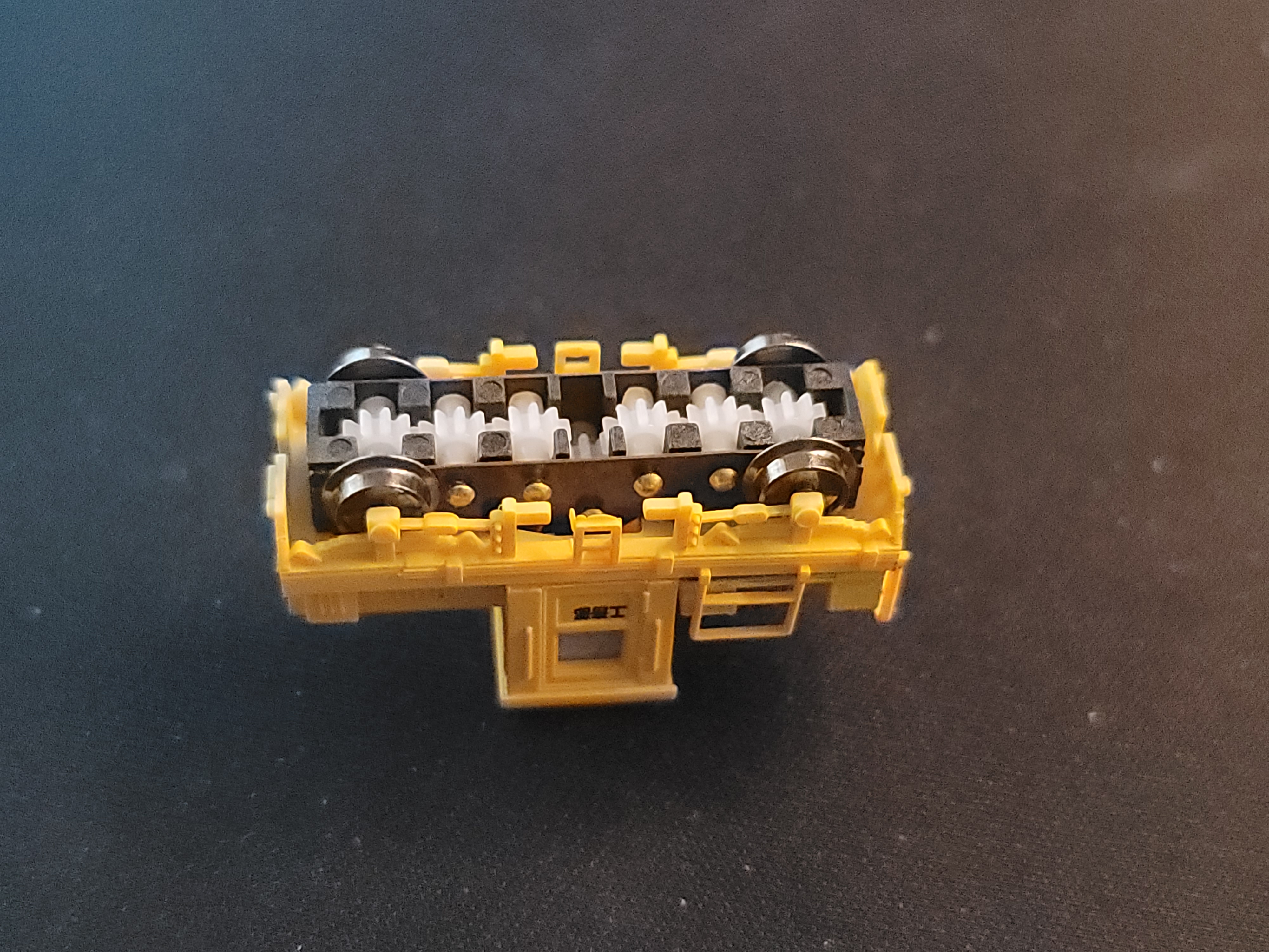 배를 까 뒤집어 보면 츠가와양행 고유의 동력차 구조가 드러난다. 아무래도 앞선 데키나 콧펠보다는 전장이 길기 때문인지(?) 차륜에서 모터에 이르는 동력을 전달하는 톱니가 중앙을 중심으로 각 3조씩 위치하고 있다. 뭐 예상하는대로 주행성능은 일반적인 철도모형 수준을 기대하는 것은 절대 무리이고, 그저 움직이는데 감사해야 할 것 정도로 보시면 될 듯. 로켓출발에 급정거는 당연한 것이고, 무게추가 있다 하더라도 근본적으로 차체가 가볍고 모터 토크가 낮다 보니, 레일의 오염상태 등 접촉면 컨디션에 주행이 꽤 영향을 많이 받는 차량이다.