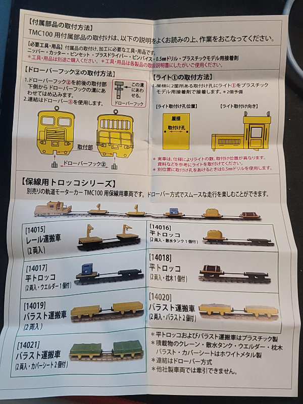 부품의 부착방법, 그리고 본 기관차에 달아줄 수 있는 별매의 트레일러 차량이 어떤 것이 있는지 설명하고 있다. 제품이 간단해서 그런지 앞선 츠가와 제품의 설명서보다는 그림도 많고 복잡한 설명이 많지 않아서 좋았다.