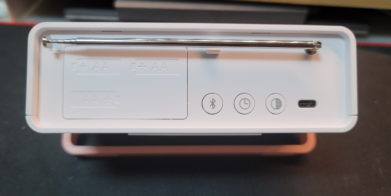 뒷면. AA 배터리를 넣는 공간이 있고 (노치가 안쪽에 숨겨져 있어 손만으로는 배터리 삽입 및 제거가 안된다. 매뉴얼에도 일자 드라이버 같은 것으로 눌러 열으라 되어 있음) FM 라디오를 위한 안테나. 그리고 블루투스 싱크/시간 변경/전면 디스플레이의 밝기 조정 버튼 등 평소에 자주 쓰지 않는 버튼들을 뒤로 빼 두었다. 마지막으로 USB-C 포트.