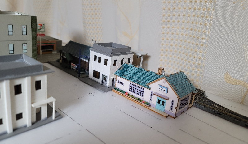 배경이 좀 꿀꿀하지만 (동계용 커튼;;;) 만들기로 해 놓고 거의 방치 중인 미니 레이아웃 한 켠에 역을 놔 봤는데 적당히 모형적인 생략도 있고 주변 미니어쳐 건물들과 잘 어울린다. 어짜피 토미테크 건물 컬렉션, 자작의 페이퍼크래프트/포맥스 건물들 짬뽕이라 디테일은 이 쪽이 더 나을지도.