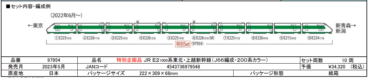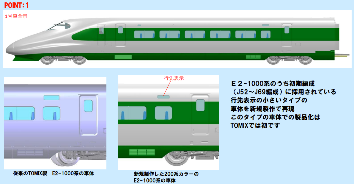 1. E2-1000계 중 초기편성(J52~J69 편성)에 채용되어 있던 행선표시가 작은 타입 차체를 신규 제작으로 재현했음. 이런 차체를 가지고 있는 제품화는 토믹스에서는 최초라고 함.
