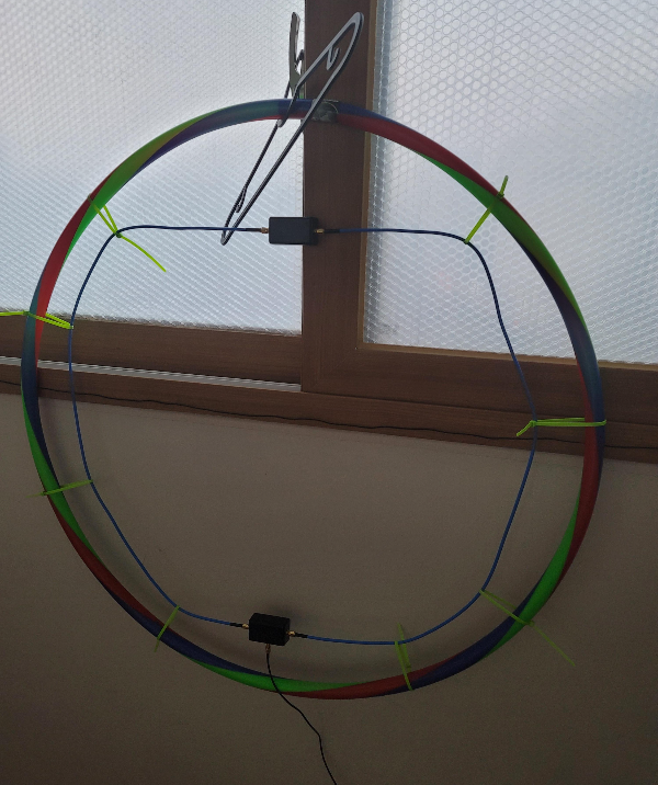 예쁘게 원형으로 고정 할 만한 공간은 없고, 창문에 붙이는 것도 지저분할 듯 하여 그냥 베란다에 이케아 플라스틱제 코트행거 하나 안테나에 걸쳐놓았더니 감자 모양이 되었다. 중간에 십자 틀 같은것을 넣어서 마름모형태로 예쁘게 만들어 사용하는 유저도 보았는데, 루프의 모양이 수신률을 얼마나 크게 높여주는 건지는 잘 모르겠다. 모양을 꼭 원형으로 만들어 주어야 한다면 시중에 판매하는 훌라후프 중 지름 60cm 되는 녀석을 구해다가 중간 벌룬 부분만 오픈 가공하고 동축 케이블은 훌라후프 안에 넣어서 동그랗게 만들어주면 그만 아닐까 싶은데 그렇게 시도한 사례는 보이지 않는다. 플라스틱 훌라후프면 절연체니 딱히 전파 영향 받지도 아니할테고 괜찮을 듯 한데.