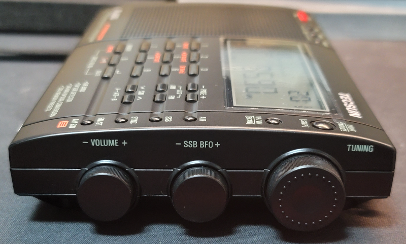 좌측부터 볼륨, SSB모드에서 좀 더 세부 튜닝할 수 있는 노브(DSB모드인 정규 라디오 방송에서는 그다지 필요없는 기능), 그리고 튜닝노브이다. 튜닝노브는 돌리는 속도가 느리면 FM 기준으로 0.01Mhz 씩 이동하며, 빨리 돌리면 돌리는 스피드를 인식하여 주파수를 일부 건너뛰어 값이 확확 돌아간다. 물론 느리게 혹은 빠르게 돌릴 수 있도록 고정 할 수도 있다.