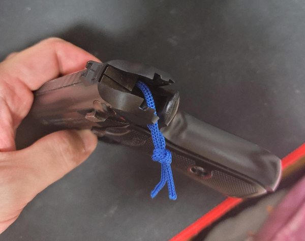 어쨌든 레버가 슬라이드 안으로 들어가면 슬라이드의 장전압, 그리고 좁은 공간 때문에 다시 레버를 정위치로 빼 내는 것이 너무 어렵다. 매번 핀셋으로 집어서 빼 내다보니 슬라이드 좌우측이 점점 벌어지기도 하고, 스트레스가 이만 저만이 아니다. 그래서 방법을 강구하다가 굴러다니는 줄을 이용해서 걸쇠 같은 것을 마련하기에 이른다.