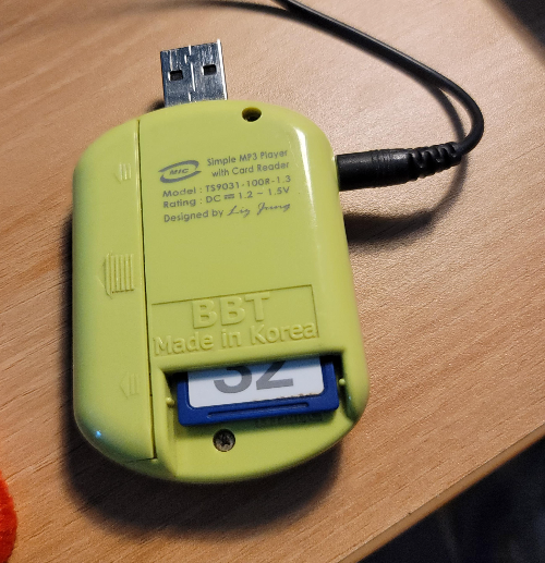 USB 단자를 보호하던 캡은 세월의 풍파를 이기지 못하고 박살나버렸지만 크디 큰 SD 카드를 삽입하고 AAA 배터리를 꽂아 돌려보니 마치 방치한 세월을 비웃듯 잘 돌아간다. 재생 모드란게 특별한 것도 없고 재생과 일시정지, 선곡과 볼륨조절 정도의 초 단순한 MP3 플레이어였다. 기억이 잘 나지 않지만 포장도 칫솔같이 블리스터백에 그냥 넣어 판매했던 것으로.