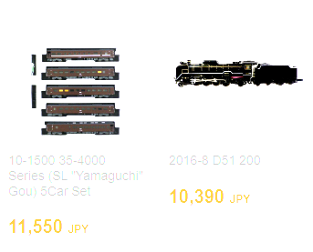 아미아미 가격표 참조. 그리고 이번 달에 카토에서 [SL 야마구치] 와 D51-200 이 재발매되었다. 보통 이런 패키지들은 재발매를 잘 하지 않는 분위기인데 인기가 좋은 상품이다 보니 정례화(?) 하려는 모양. 지난 번 구매를 놓친 분들에게는 좋은 기회.
