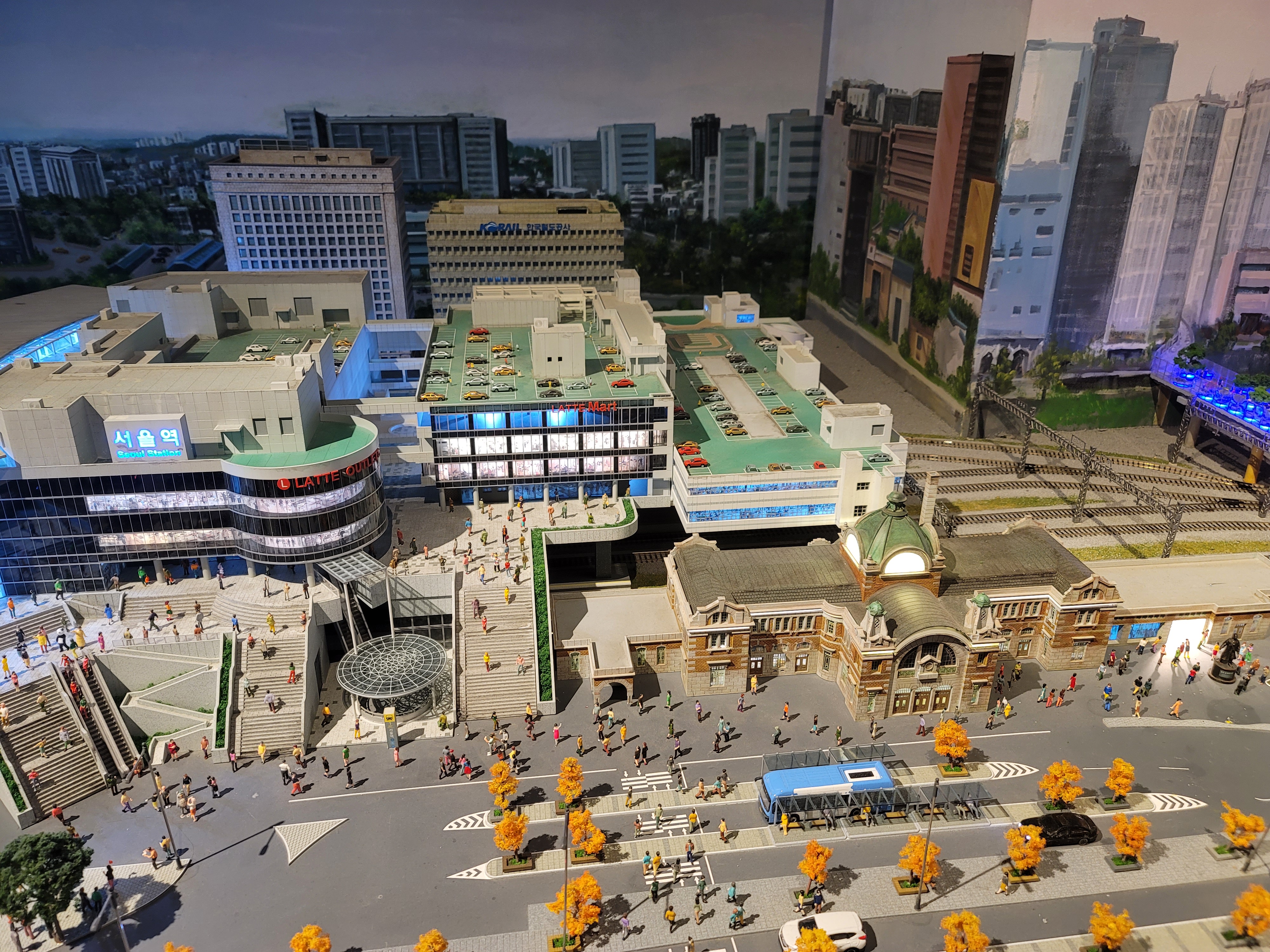 서울역. 구청사와 신청사 모두 비교적 정밀하게 잘 재현했다. 요소요소 깨알같은 스토리 같은 것도 숨겨둔 것은 함부르크에 있는 미니어처 분더란트를 꽤 참조한 듯 하다. 물론 공항을 재현해서 점보기가 뜨고 내리는 기믹까지 재현한 그 규모에 미칠 바는 아니지만 적어도 일반인들에게도 잘 알려져 있는 의왕철도박물관의 그것 보다는 훨씬 충실하게 채워져 있다. 레이아웃의 방향성은 다르지만, 그 쪽도 조금 더 투자를 해서 다채로운 스토리를 녹여낼 수 있다면 좋으련만.
