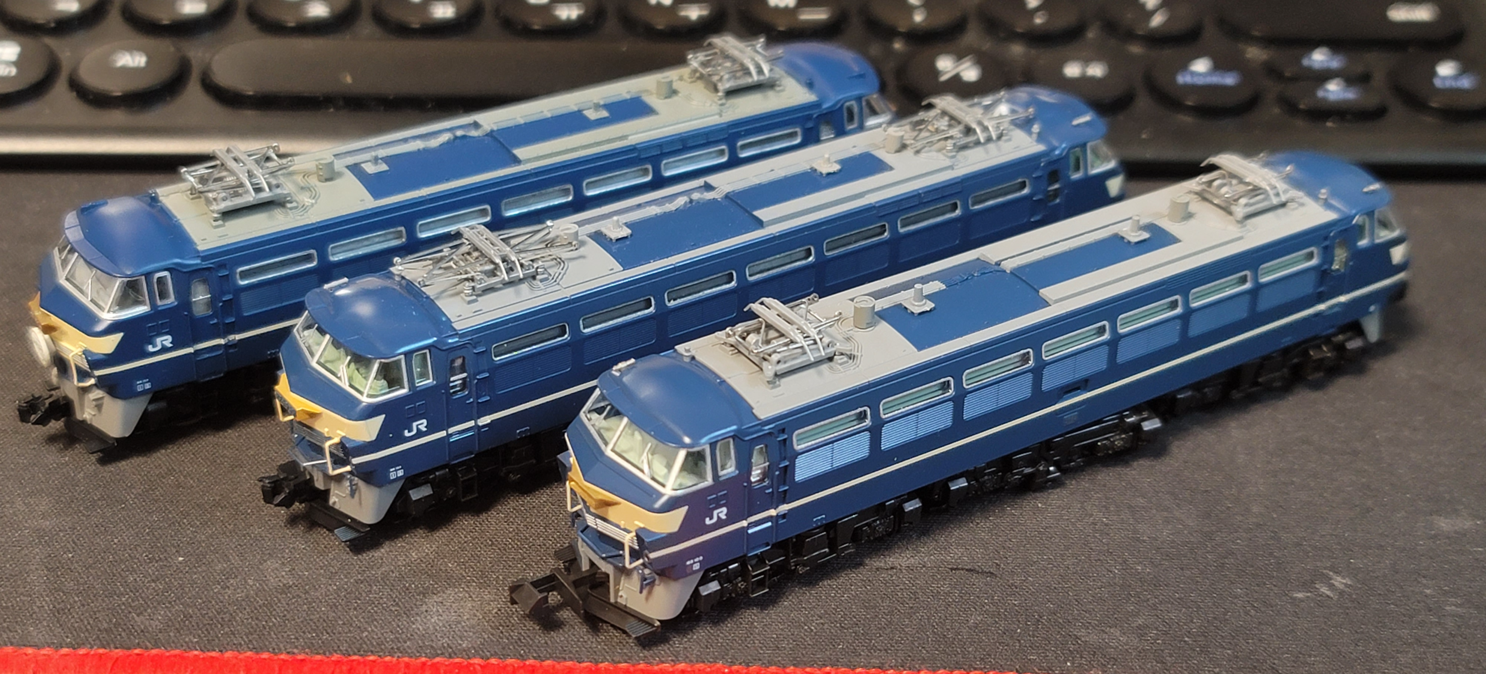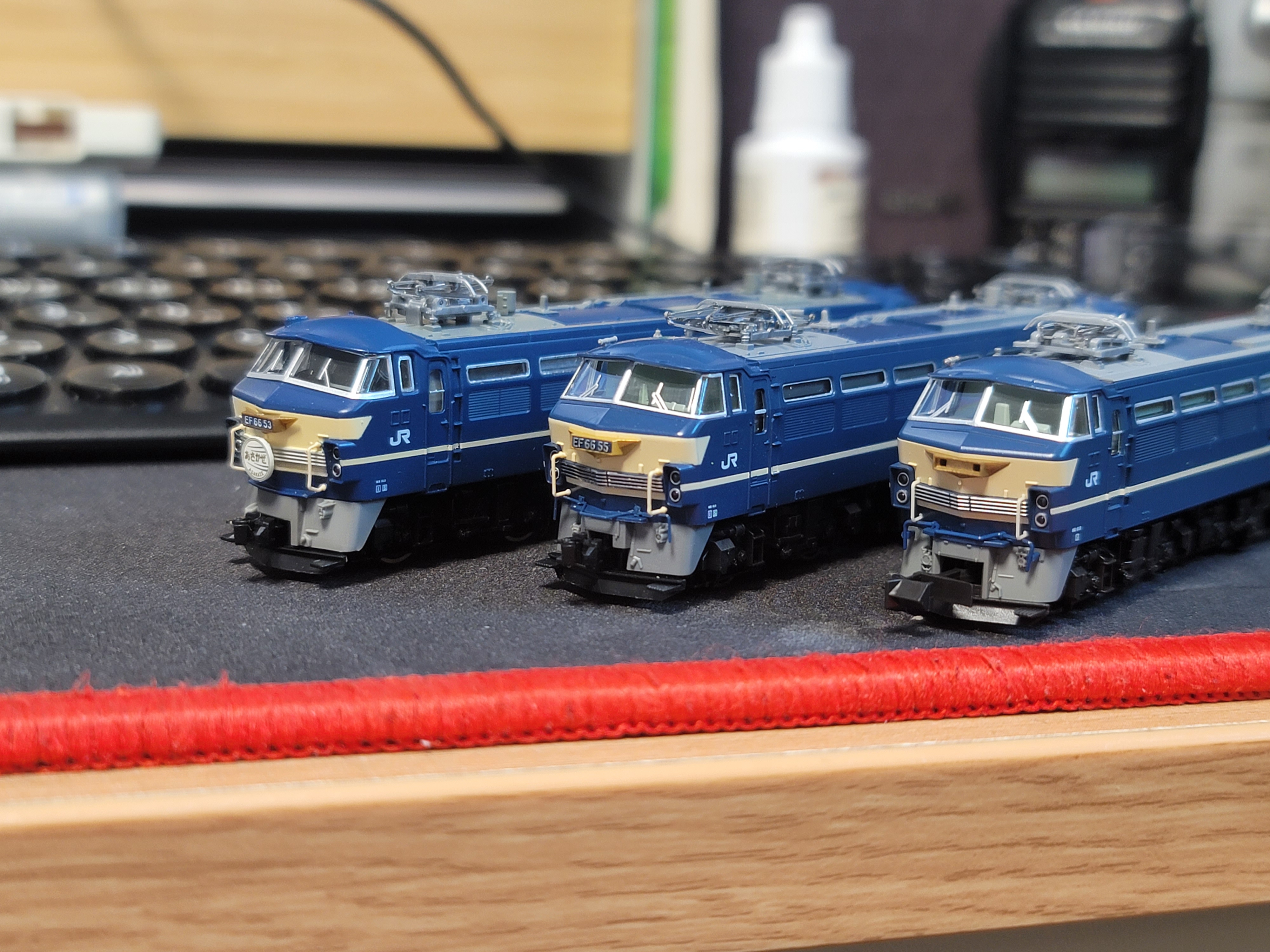 위로부터 블루트레인 세트 박스 안으로 옮겨놓은 리뉴얼판 토믹스 EF66-0형 후기형 모델(차번 EF66-55인데, 하필이면 사고로 인해 90년대에 조기 폐차된 차번이라 함. 그런 줄 알았다면 이 번호를 선택하지 않았을 듯), 중간차량이 원래 블루트레인 세트 안에 들어있던 가장 최초 구입했던 EF66 베이직 기관차(차번 EF66-53으로 출시 때 부터 고정), 그리고 아래 것이 이번에 구입한 카토의 EF66 이다. 실차 모두 가와사키 중공업 제조의 2차차 말기 차량을 재현한 차량이고, 특징적으로 토믹스의 EF66 후기형 차량만 대형의 팬터그래프를 채용하고 있다. 보시는 대로 카토 것 차번을 아직 선택하지 못했는데, 역사와 무관하게 보유한 차량의 홀수 짝을 맞추기 위해 EF66-51을 할 것이냐, 형제기중 가장 오래동안 운전되었다 반갈죽되어 어딘가의 전시관에 얼굴만 보관되어 있다는 EF66-49를 달 것이냐 고민 중이다.