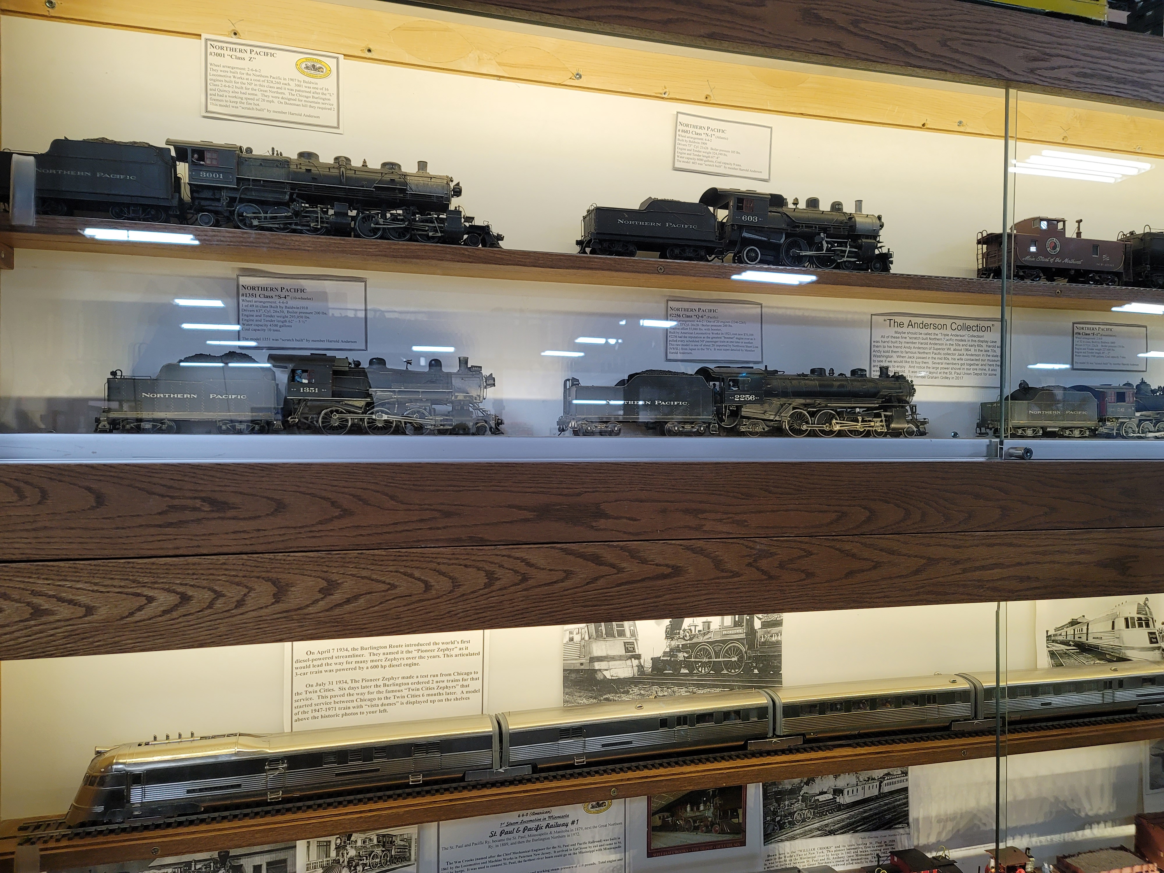 설명란 위에는 한 때 노던 퍼시픽에서 운영되었던 차량들의 모형들을 잘 전시해 두었다. 최소 HO 게이지, 혹은 O 게이지 차량인데 초기 구매 비용만 해도 상당했을 것 같다. 박물관의 분위기를 보아하니 어느 개인이나 욕심많은 사업자가 이 곳을 돈 벌이 수단으로 운용한다기 보다는 철도모형을 사랑하는 지역민들의 동호회 중심으로 십시일반하여 자료와 모형 일체를 기증 형식으로 채워 나가는 듯 했다. 주 손님들은 거의 대부분 저연령층 어린이들이었으나, 레이아웃을 중심으로 제법 '테츠오타' 같은 배불뚝이 할배들이 꽤 심도있는 대화를 나누는 것을 어렵지 않게 구경할 수 있었다.
