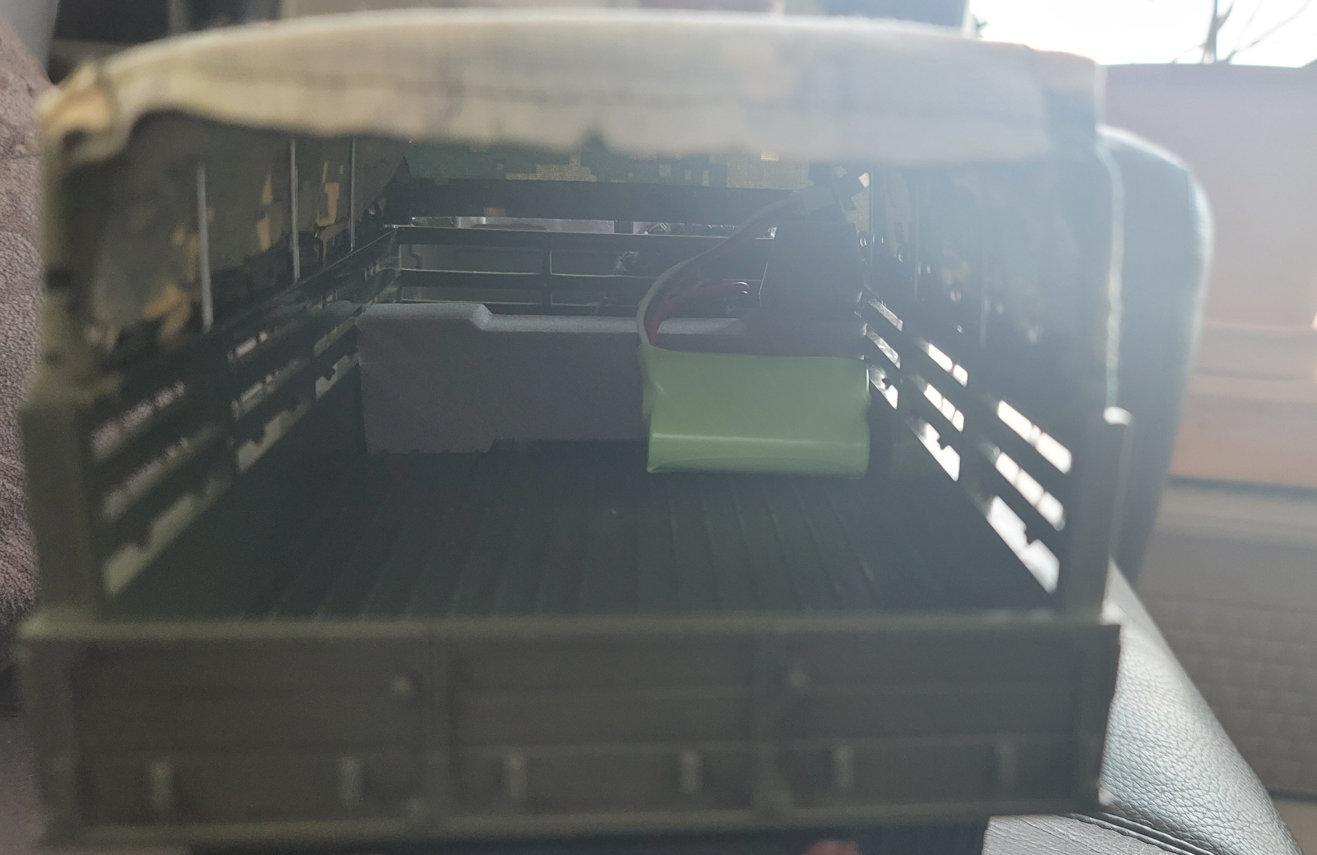 스피커도 폼 너머에 고정 해 두었고, 흔들림 방지를 위해 철도모형 북케이스에서 빼낸 폼을 하나 사이에 끼워 둠. 별도 적재함을 만들어 주면 좋겠지만 캔버스 씌워 다닐거면 굳이 필요하지 않기에 역시 타협한 포인트 중 하나가 되었음.