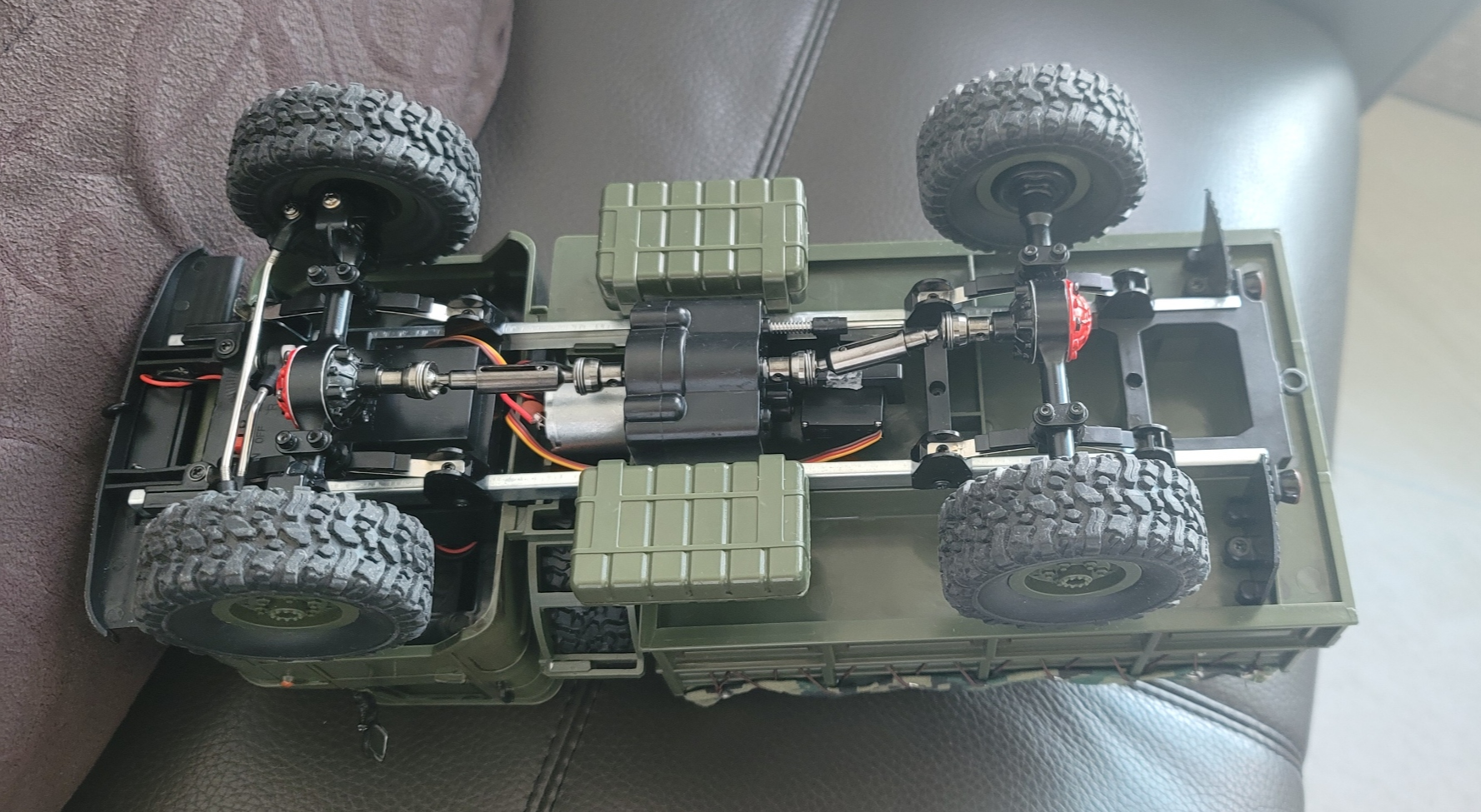 현재 업그레이드 된 차량의 바닥면. 저속/고속 기어 교체가 가능한, 390 모터가 장착된 기어박스가 기름통 중앙에 위치 해 있고 금속 구동축을 지나 금속으로 된 디퍼렌셜을 경유, 바퀴로 동력이 전달된다. 공홈에서 'KM'이라고 된 메탈 키트의 최종형이 이 형태라고 보면 되는데 RTR 과 kit이라 된 조립필요 제품은 플라스틱 구동축임.