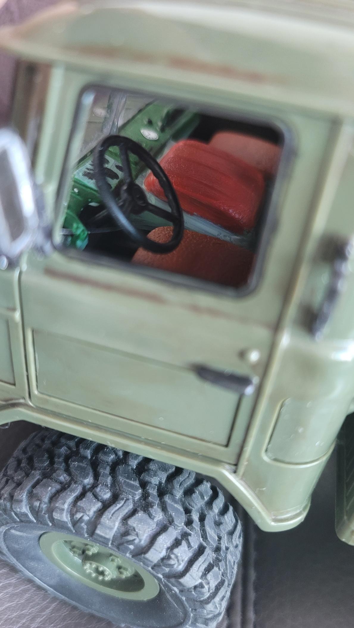 내부는 부족하나마 아크릴 물감 사용하여 좌석, 패널 들을 색칠함. 1/16 스케일인지라 실력만 되면 전면 패널의 이런저런 장비들에 디테일을 더 해줄 수 있을 것 같은데, 역시 실력이 되지 않아 그저 색칠하는 걸로 만족해야 할 듯 하다. RC 주행 시 운전사 없이 움직이는 것이 마치 이 차량이 미래의 무인주행 차량인듯 착각을 일으키는 관계로, 1/16 스케일 인형을 사다가 넣어주려고 몇 개를 오더 내었다가