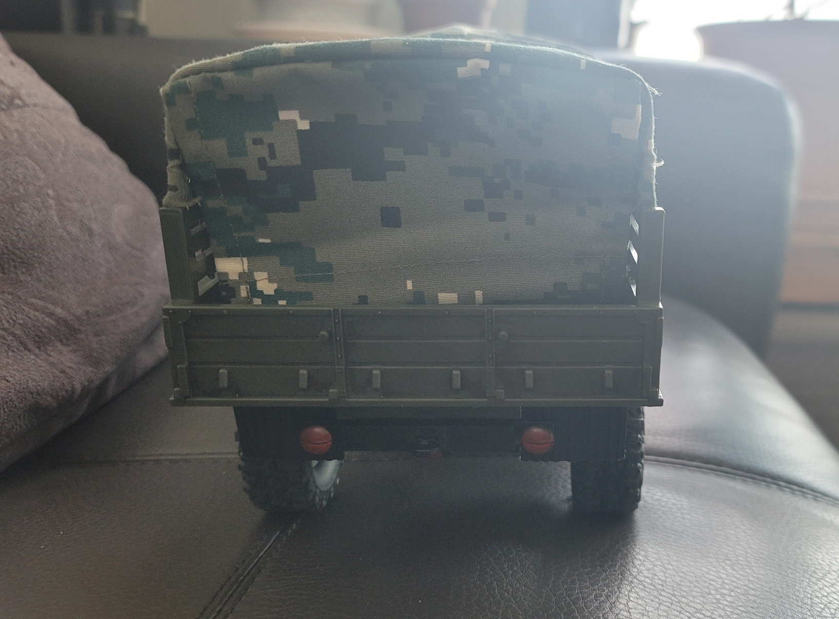 이렇게 캔버스를 가려 놓으면 안에서 배터리가 굴러댕기는지 알 길이 없다. 뒷면의 디테일이 좀 아쉬운데 뒷등을 묘사한 저 형태(?) 는 프레임을 잡기위한 부품에 통짜로 사출된 후 단순 색칠 한 것이고, 역시 GAZ-66 차량의 후미등 고증과는 사뭇 다르다 - 실제 차량의 후미등은 적재함 양쪽 끝 아래 위치해야 함. 다른 유저들은 실제위치에 3D 프린팅이든 자작이든 투명 파츠와 LED를 구해서 달아주는 작업을 하거나, 붉은색 뒷등 형태 중앙에 3mm 천공을 만든 뒤 LED를 심어 단순하게 끝내는 방법을 사용하고 있다. 아마도 내 경우도 굳이 등을 단다면 후자의 방향을 고려하지 않을까 싶다.
